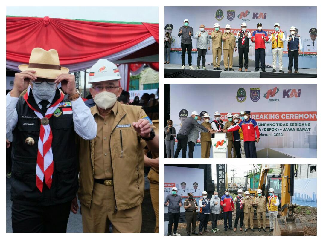 KOTA DEPOK — Gubernur Jawa Barat, Ridwan Kamil, di dampingi Wali Kota Depok Mohammad Idris, dan Wakil Walikotanya, Imam Budi Hartono, secara simbolis meresmikan Groundbreaking Ceremony (GC) pembangunan Simpang Tidak Sebidang, Senin (14/2/2022), di Jalan Dewi Sartika Depok, Jawa Barat.
