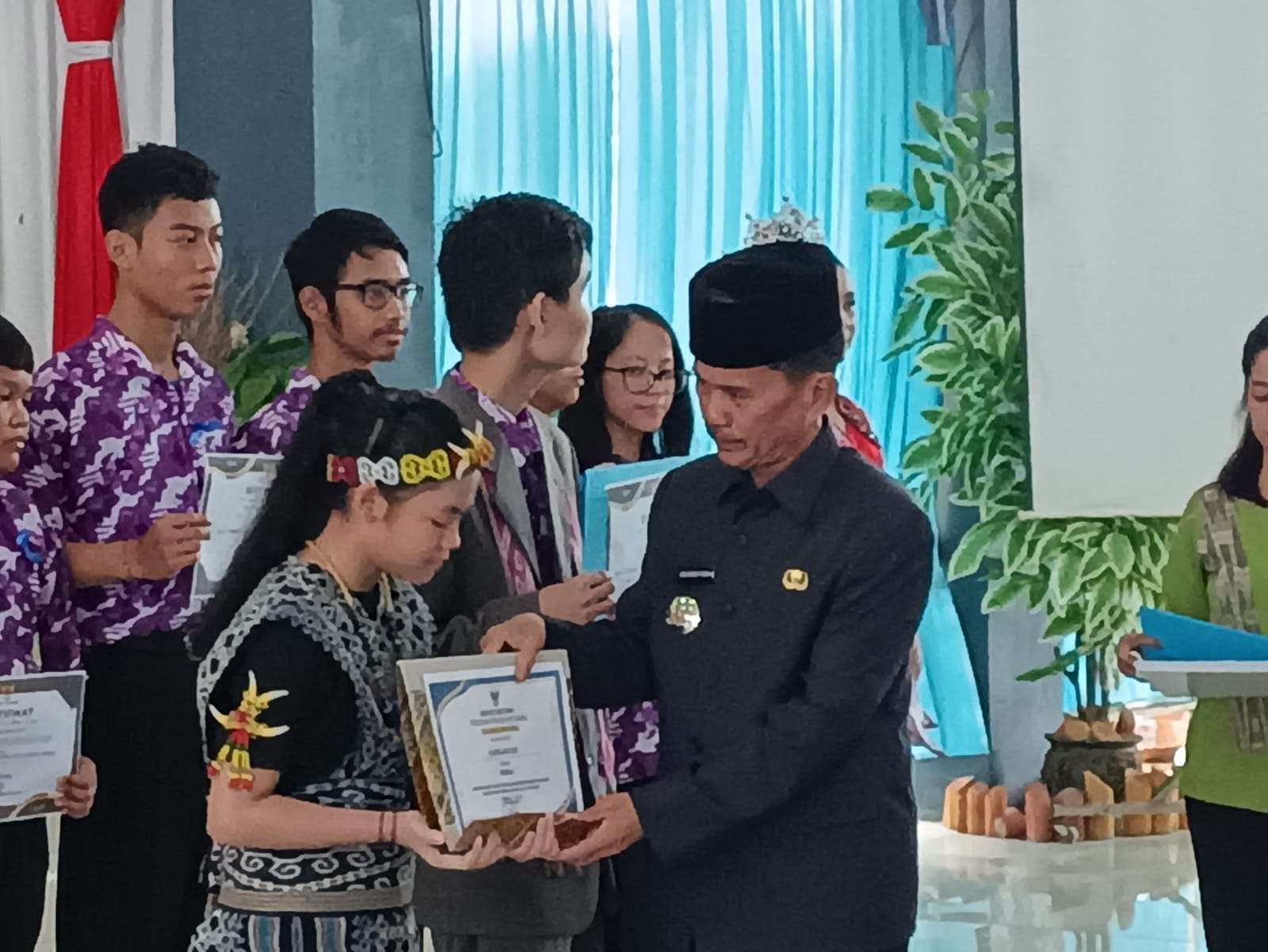 Sebagai bentuk bangganya Bupati Sintang terhadap prestasi yang sudah diraih oleh anak-anak Kabupaten Sintang tersebut, beberapa anak berprestasi diundang oleh Bupati Sintang berdiri bersama di depan.