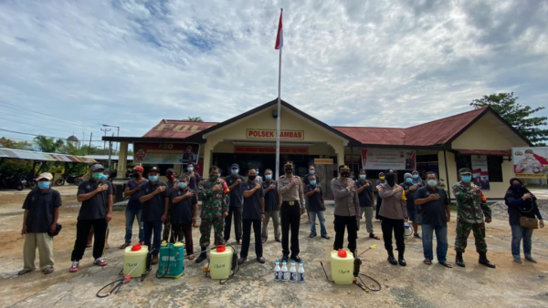 Sambas Dalam rangka menekan Penyebaran Covid-19 di wilayah territorial Kodim 1208/Sambas, Danramil 01/Sambas Kapten Inf Sulistiyono turun langsung bersama Kapolsek Sambas AKP Abdul Muthollib, Kades Durian Bpk Drs. Marsudi, Relawan Posko PPKM Mikro COVID-19 Desa Durian melakukan penyemprotan Disinfektan di Beberapa Fasilitas umum salah satunya tempat ibadah Wilayah Kecamatan Sambas Kab. Sambas, Beberapa hari lalu.