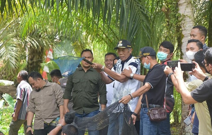 Bupati Sintang dr. H. Jarot Winarno, M. Med. PH di dampingi Kapolres Sintang AKBP Tommy Ferdian, S.I.K, M. Sc (ENG), Dandim 1205 Sintang Letkol Inf Kukuh Suharwiyono, B.S., MITM., M.Si melepas bibit ikan gurami dan ikan nila bangkok serta panen ikan nila dan paten di kolam milik Kelompok Tani Binaan Kontak Tani Nelayan Andalan (KTNA) Kabupaten Sintang, di Dusun Suka Maju Jalur F, Desa Binjai Hilir Kecamatan Binjai Hulu pada Sabtu, 12 Maret 2022.
