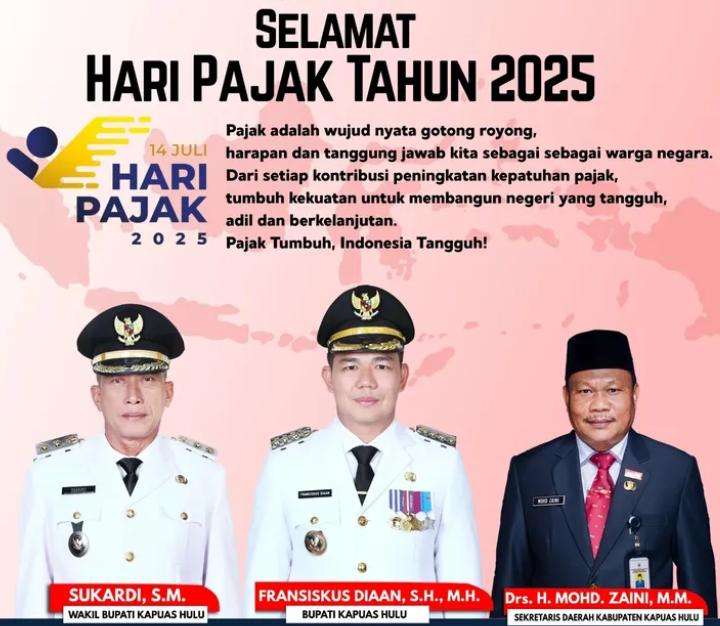 Pada 14 juli 2025, dalam rangka memperingati Hari Pajak Nasional Tahun 2025, jajaran Pemerintah Kabupaten Kapuas Hulu yang terdiri dari Bupati Fransiskus Diaan, Wakil Bupati Sukardi, dan Sekretaris Daerah Drs. H. Mohd. Zaini, M.Si, menyampaikan ucapan selamat dan apresiasi tinggi kepada seluruh insan perpajakan yang telah berkontribusi dalam pembangunan bangsa, khususnya di Kabupaten Kapuas Hulu.