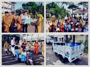 Bantuan unit kendaraan listrik diberikan langsung Penjabat (Pj) Walikota Serang Yedi Rahmat yang berkolaborasi dengan Manager UPT Cikupa, Joko Muslim kepada Ketua Bank Sampah Citra Lestari Heni Saditya, saat apel peringatan Hari Lingkungan Hidup Sedunia Tahun 2024, Senin (10/6/2024), di Halaman Balaikota Serang Banten.